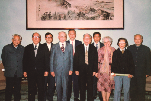 全国人大常委会原副委员长严济慈会见法国数学家H.Carton,左起:吴文俊、汪德昭、成平、H.Carton、严幼光、严济慈、石赫、H.Carton夫人、陈丕和、钱三强
